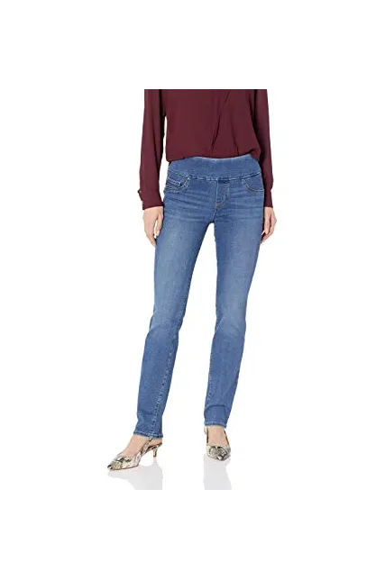 - Mid rise, slim fit with pull on elastic waistband