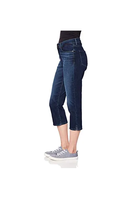 - Mid stretch denim and easy through hip and thigh; side slits at hem