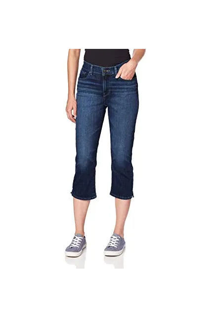 - Mid stretch denim and easy through hip and thigh; side slits at hem