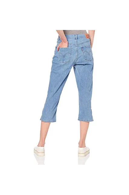 - Mid stretch denim and easy through hip and thigh; side slits at hem