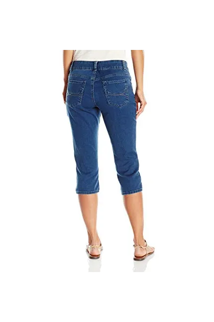 - Mid-rise jean in stretch denim featuring cropped capri silhouette and five-pocket styling