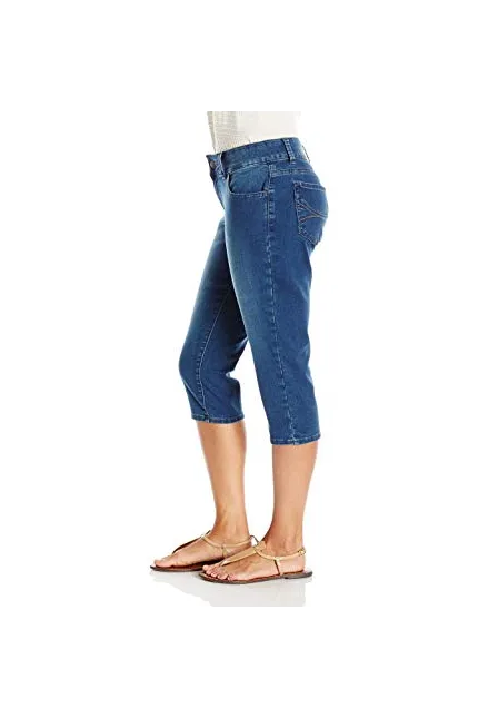 - Mid-rise jean in stretch denim featuring cropped capri silhouette and five-pocket styling