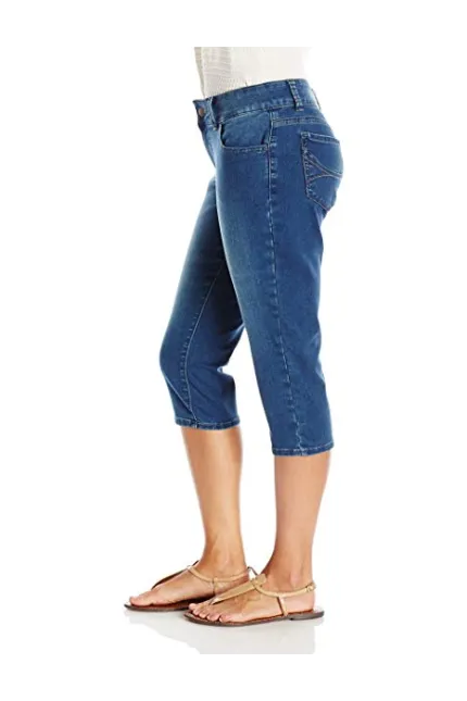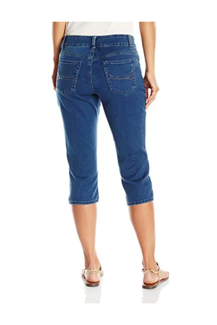 - Mid-rise jean in stretch denim featuring cropped capri silhouette and five-pocket styling