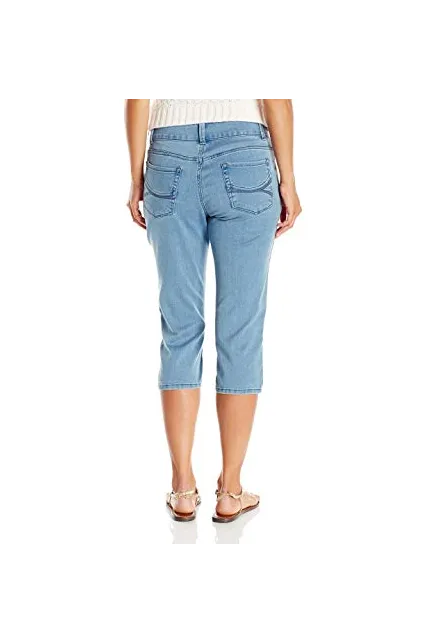 - Mid-rise jean in stretch denim featuring cropped capri silhouette and five-pocket styling