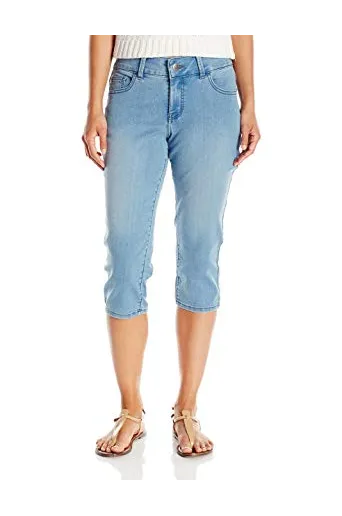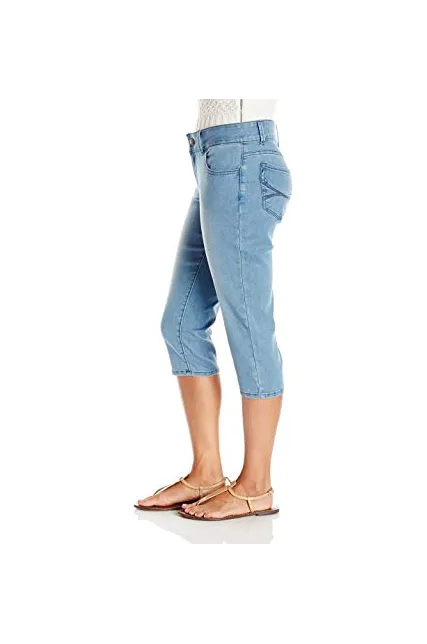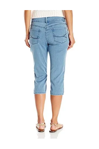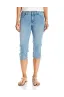 - Mid-rise jean in stretch denim featuring cropped capri silhouette and five-pocket styling