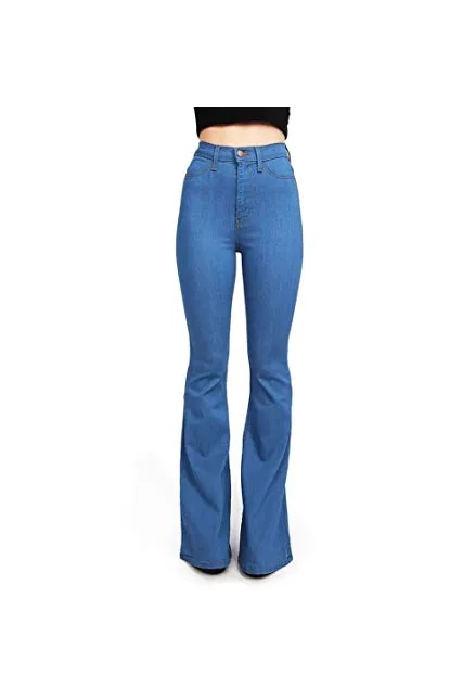 - High waist fitted denim pants with flared bottoms. Light vintage wash. Faux pockets on the front with button and zip fly. Comfortable stretchy material. Looks great with a cropped tee or tank. For a dressier look tuck in a chiffon cami or blouse, juniors sizing.