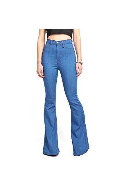- High waist fitted denim pants with flared bottoms. Light vintage wash. Faux pockets on the front with button and zip fly. Comfortable stretchy material. Looks great with a cropped tee or tank. For a dressier look tuck in a chiffon cami or blouse, juniors sizing.
