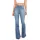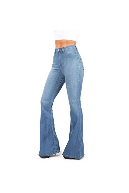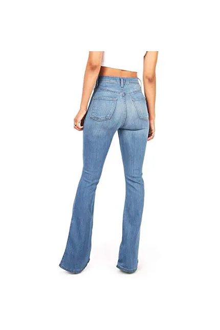- High waist fitted denim pants with flared bottoms. Faded wash around the thighs. Faux pockets on the front with button and zip fly. Comfortable stretchy material. Looks great with a cropped tee or tank. For a dressier look tuck in a chiffon cami or blouse, juniors sizing.