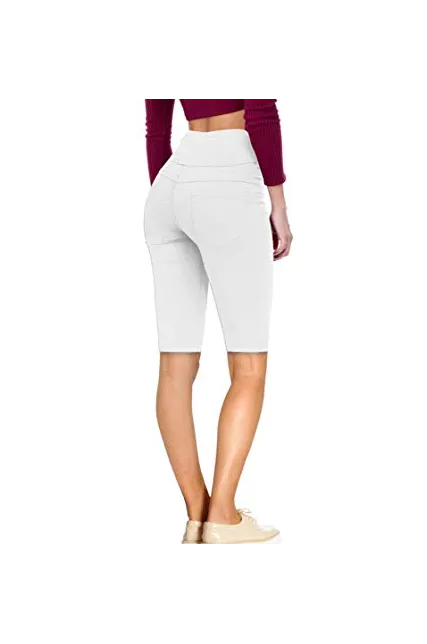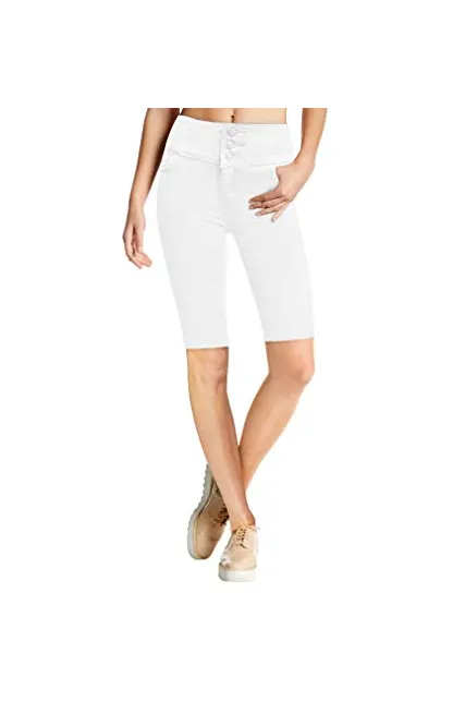 Women Butt Lift 3 Button High Wide Waist Stretch Denim Skinny Jeans Capri Bermuda Short