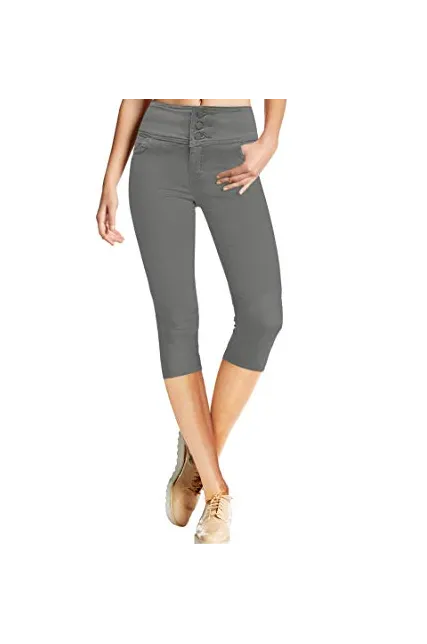 Women Butt Lift 3 Button High Wide Waist Stretch Denim Skinny Jeans Capri Bermuda Short
