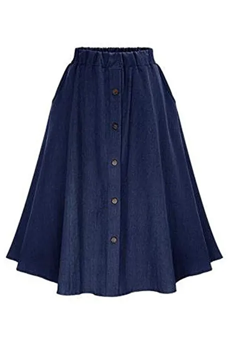 - Button front,Side pockets,Elastic waist,Denim A-line pleated midi skirt