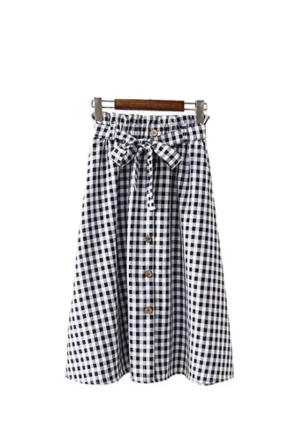 - Plaid,Bowknot,Button front,A-line pleated midi skirt with waist tie