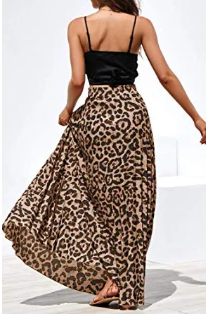 - Women leopard print maxi skirts, Front drawstring waist, High waisted, Floor length, Swing summer beach skirt