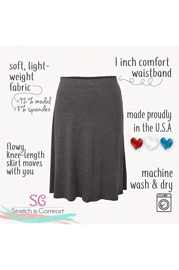 - WHY DO CUSTOMERS LOVE STRETCH IS COMFORT? Our company was founded by a stay at home mother who understands the importance of affordable, comfy clothes for both her children and herself. All of our clothing is proudly made right here in the U.S.A. This knee length A-line flowy skirt is made with high-quality materials and comes in sizes for women and children. We provide a wide variety of color options for every occasion and to fit every personality!