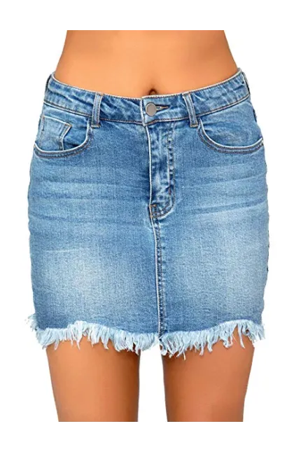 - Basic five pockets and button-and-zipper closure. Short jean skirt features stylish fringed hem for sweet girly vibes.