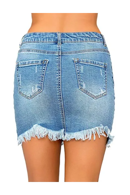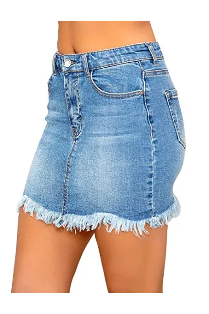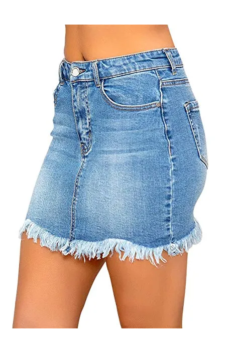 - Basic five pockets and button-and-zipper closure. Short jean skirt features stylish fringed hem for sweet girly vibes.