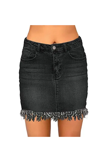 - Basic five pockets and button-and-zipper closure. Short jean skirt features stylish fringed hem for sweet girly vibes.
