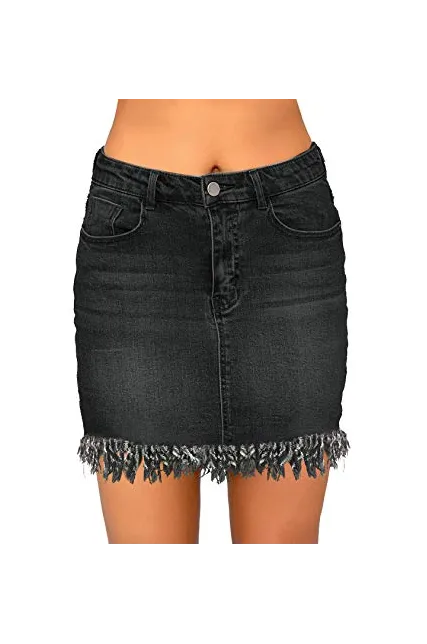 - Basic five pockets and button-and-zipper closure. Short jean skirt features stylish fringed hem for sweet girly vibes.