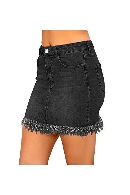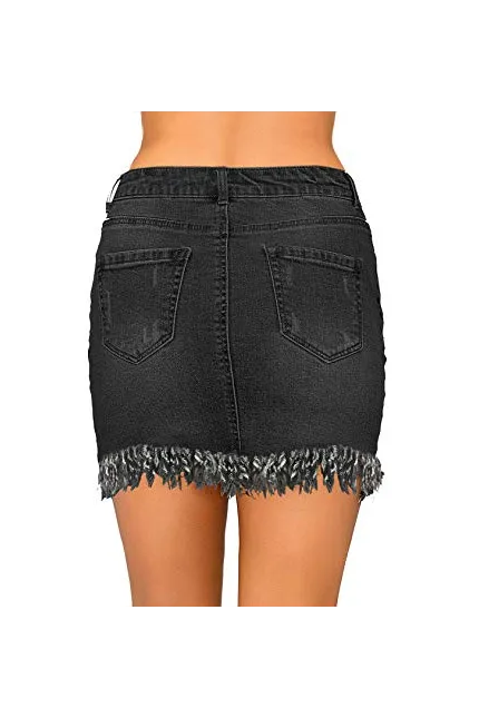 - Basic five pockets and button-and-zipper closure. Short jean skirt features stylish fringed hem for sweet girly vibes.