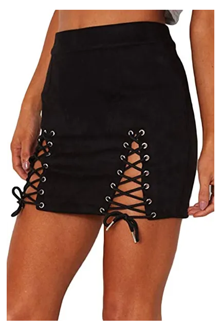 - Double Criss-Cross Lacing Up Split Side,High Waist Bodycon Faux Suede Mini Pencil Skirt