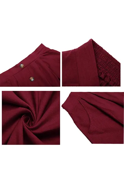 - Features:button decoration,a-line design,two pockets on both side,elastic waist on the back,high waisted,solid color