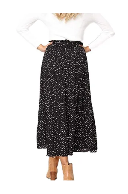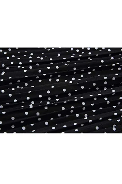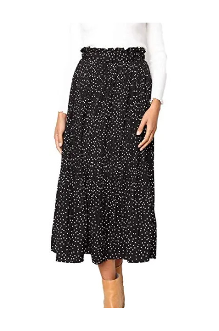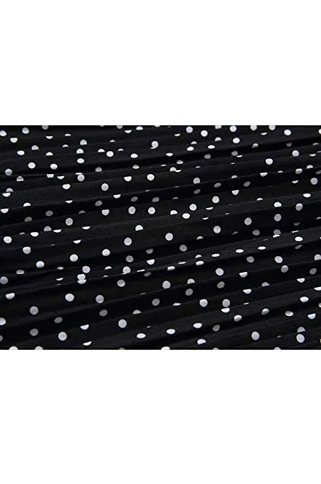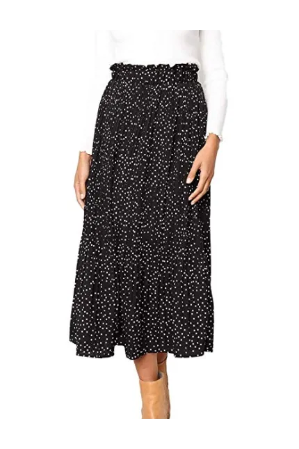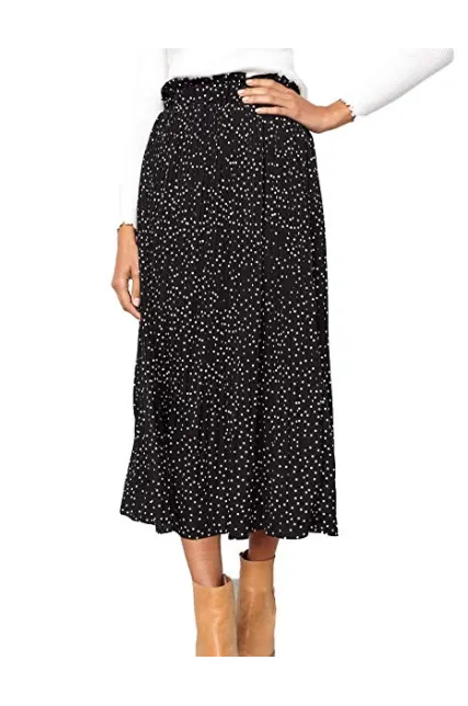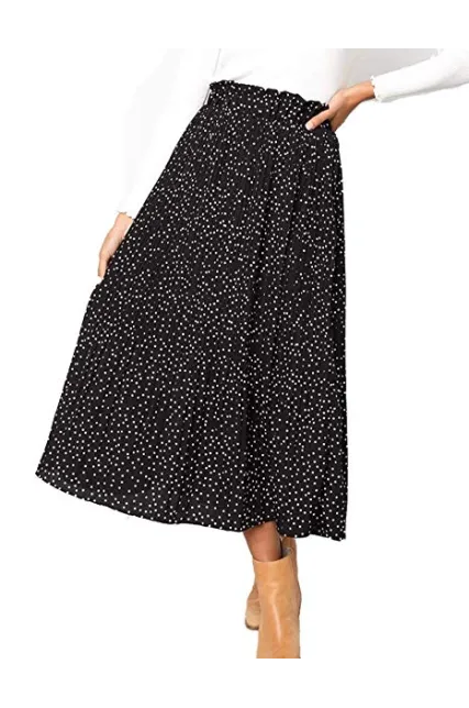 - Designs: high waist, elastic waistband, two pockets, pleated, A-line, polka dot, midi skrit.