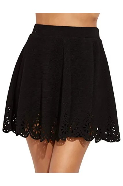 - A-line flared silhouette,high waistband,and laser cutout scallop hem textured skirt