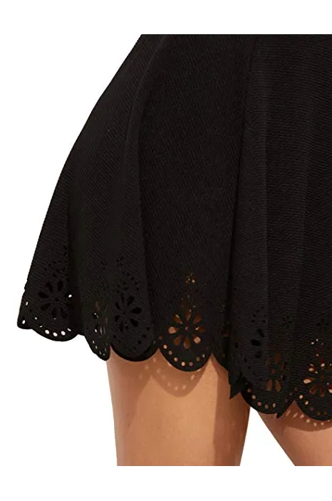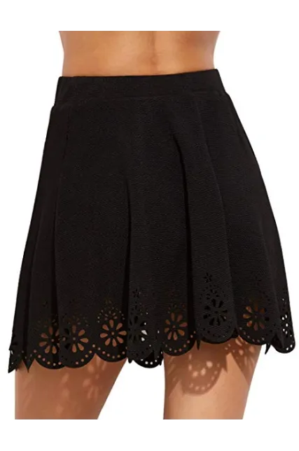 - A-line flared silhouette,high waistband,and laser cutout scallop hem textured skirt