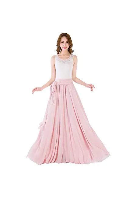 Sinreefsy Summer Chiffon High Waist Pleated Big Hem Floor/Ankle Length Beach Maxi Skirt for Women Wedding Party