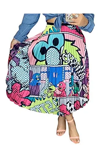 ThusFar Women's Graffiti Pleated Skirts Cartoon Printed Elastic Waist A-Line Swing Midi Skirt