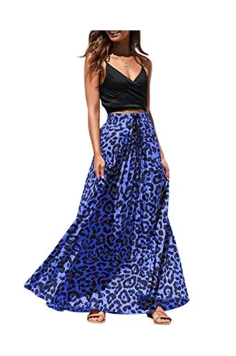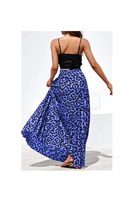 Womens Maxi Skirt Leopard Print Chiffon Beach Pleated High Waisted A-Line Long Skirts