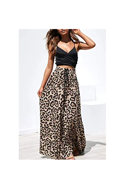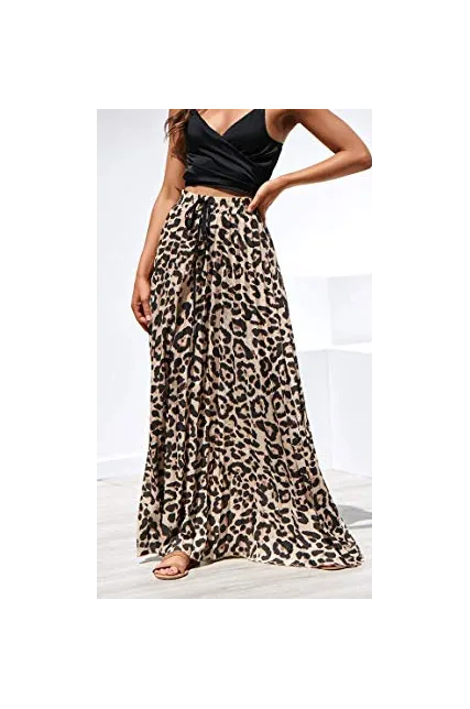 - Features: High rise, elastic waist, with drawstring, pleated, flowy and flared, a line, floor length long skirt, leopard print maxi skirt.