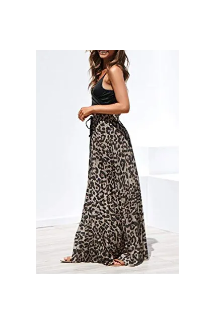 - Features: High rise, elastic waist, with drawstring, pleated, flowy and flared, a line, floor length long skirt, leopard print maxi skirt.