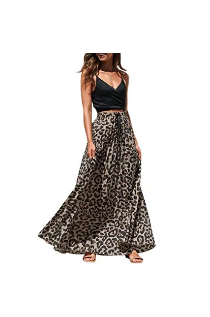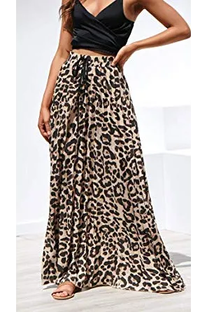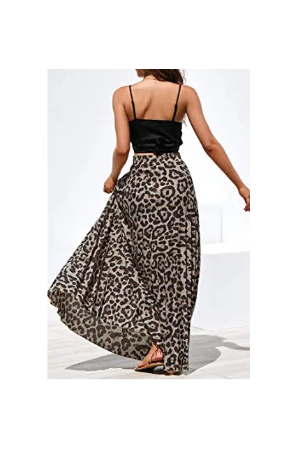 - Features: High rise, elastic waist, with drawstring, pleated, flowy and flared, a line, floor length long skirt, leopard print maxi skirt.