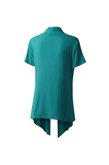 - A short sleeve cardigan features an open front and assymetrical hem