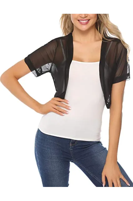 - TOUCH OF STYLE: Add a beautiful dynamic to any outfit with our short sleeve bolero shrug. This bolero jacket features a mesh Crochet, Open Front Cropped Design detail, a chic design, and a beautiful cut to crown it off. Choose from our lovely colors and treat yourself to a layering accessory you’ll simply love.
