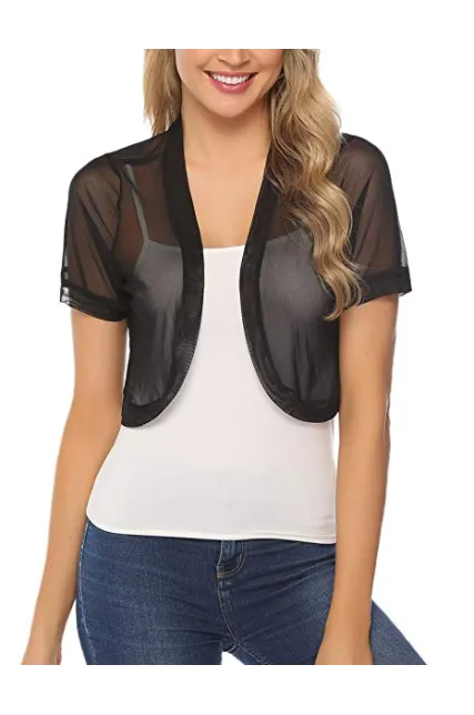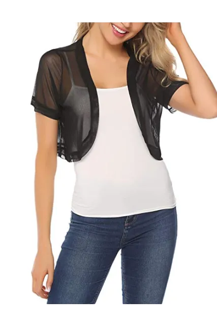 - TOUCH OF STYLE: Add a beautiful dynamic to any outfit with our short sleeve bolero shrug. This bolero jacket features a mesh Crochet, Open Front Cropped Design detail, a chic design, and a beautiful cut to crown it off. Choose from our lovely colors and treat yourself to a layering accessory you’ll simply love.