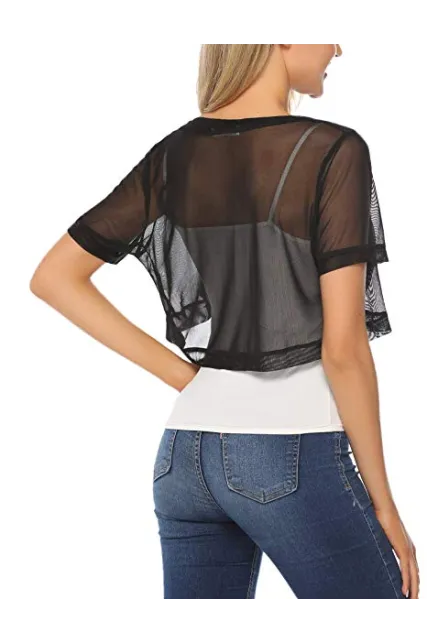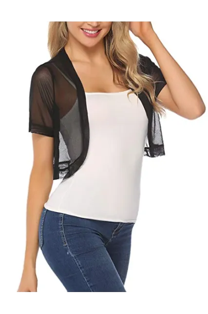 - TOUCH OF STYLE: Add a beautiful dynamic to any outfit with our short sleeve bolero shrug. This bolero jacket features a mesh Crochet, Open Front Cropped Design detail, a chic design, and a beautiful cut to crown it off. Choose from our lovely colors and treat yourself to a layering accessory you’ll simply love.