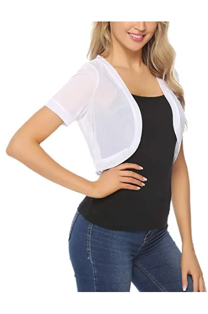 - TOUCH OF STYLE: Add a beautiful dynamic to any outfit with our short sleeve bolero shrug. This bolero jacket features a mesh Crochet, Open Front Cropped Design detail, a chic design, and a beautiful cut to crown it off. Choose from our lovely colors and treat yourself to a layering accessory you’ll simply love.