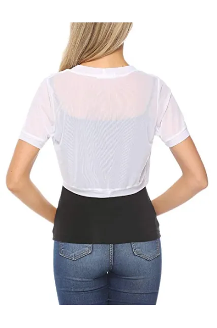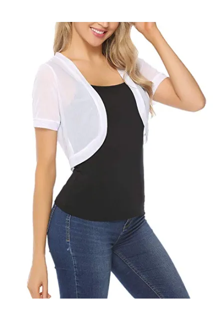 - TOUCH OF STYLE: Add a beautiful dynamic to any outfit with our short sleeve bolero shrug. This bolero jacket features a mesh Crochet, Open Front Cropped Design detail, a chic design, and a beautiful cut to crown it off. Choose from our lovely colors and treat yourself to a layering accessory you’ll simply love.