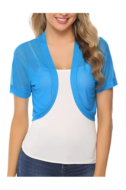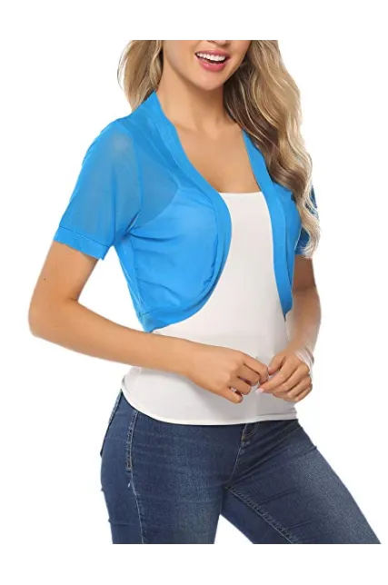 - TOUCH OF STYLE: Add a beautiful dynamic to any outfit with our short sleeve bolero shrug. This bolero jacket features a mesh Crochet, Open Front Cropped Design detail, a chic design, and a beautiful cut to crown it off. Choose from our lovely colors and treat yourself to a layering accessory you’ll simply love.