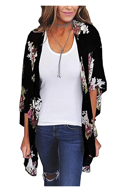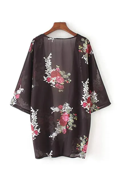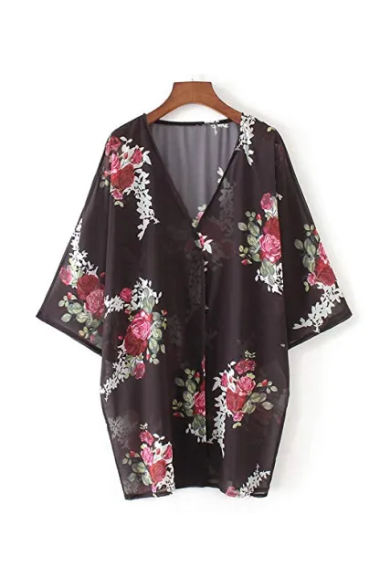 - Fashion kimono style, flower print, bat sleeve, open placket, drop shoulder, relaxed fit, soft and lightweight material