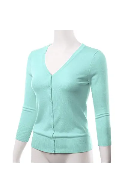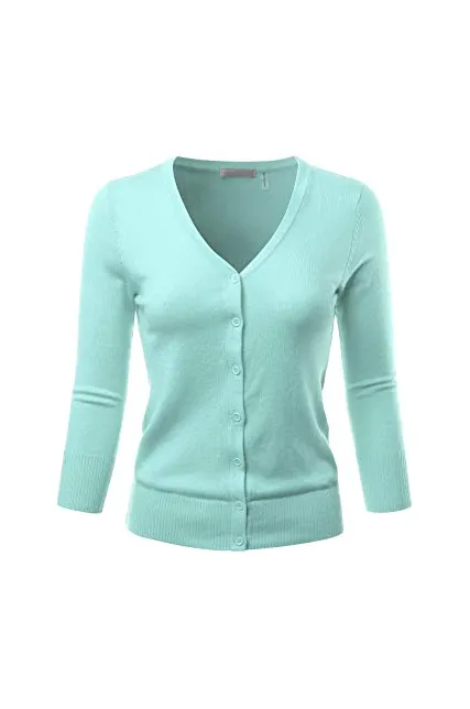 - Casual Basic Slim Fit Three Quarter Sleeve Button Down V-Neck Stretch Knit Cardigan Sweater