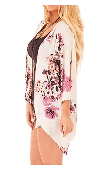 Finoceans Womens Floral Chiffon Kimono Cardigans Loose Beach Cover Up Half Sleeve Tops
