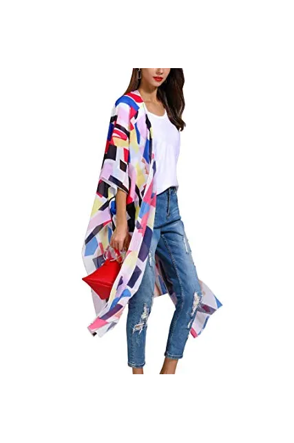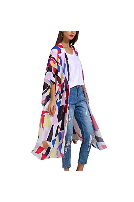 Hibluco Women's Sheer Chiffon Floral Kimono Cardigan Long Blouse Loose Tops Outwear