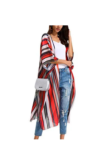 Hibluco Women's Sheer Chiffon Floral Kimono Cardigan Long Blouse Loose Tops Outwear