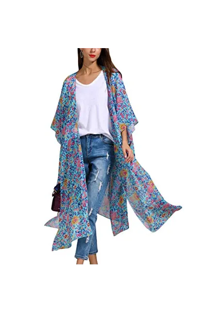 Hibluco Women's Sheer Chiffon Floral Kimono Cardigan Long Blouse Loose Tops Outwear