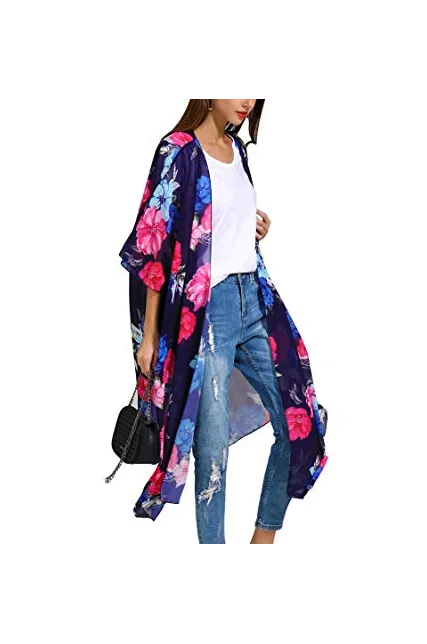 Hibluco Women's Sheer Chiffon Floral Kimono Cardigan Long Blouse Loose Tops Outwear