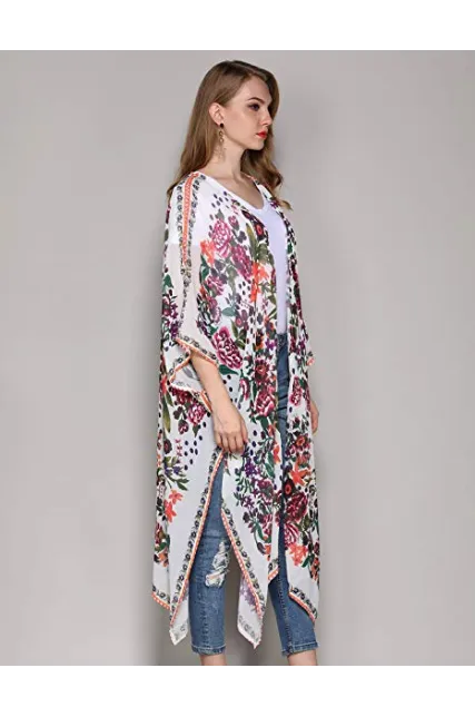 Hibluco Women's Sheer Chiffon Floral Kimono Cardigan Long Blouse Loose Tops Outwear
