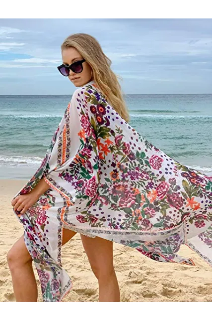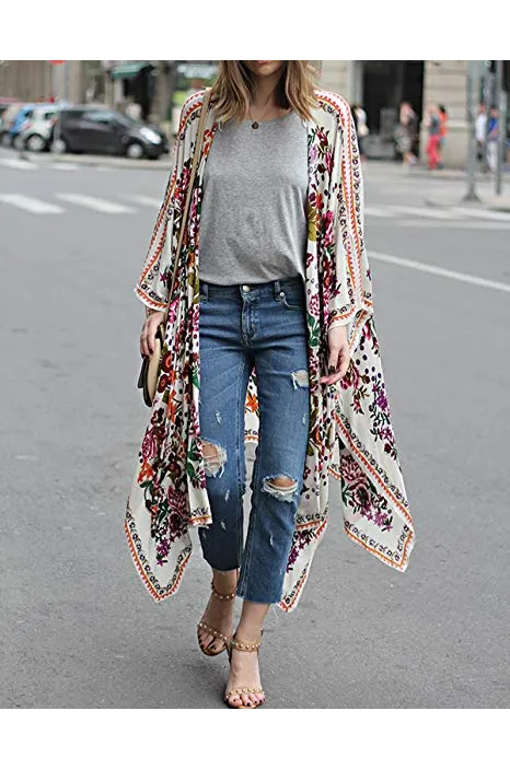 Hibluco Women's Sheer Chiffon Floral Kimono Cardigan Long Blouse Loose Tops Outwear